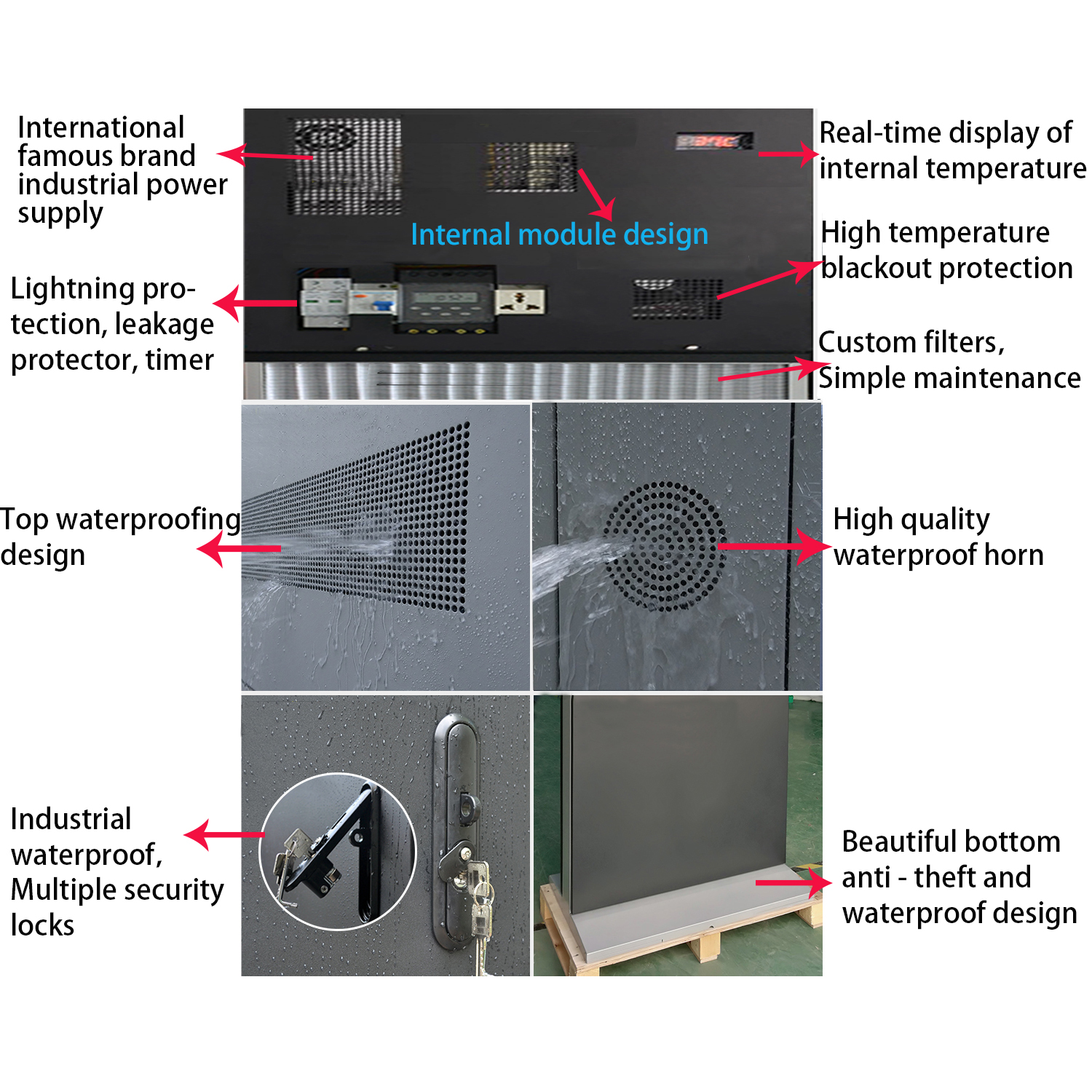 | Waterproof | IP65,Three layer compound sealant strip, multi angle water free,Three level door lock protection, hidden screw design | |